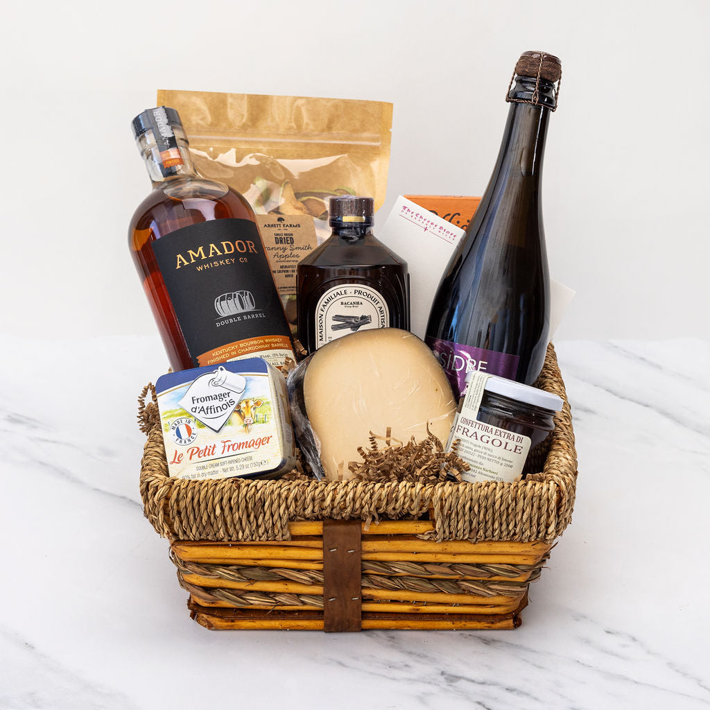 Indulge in a delightful combination of flavors with this thoughtfully curated gift basket. Featuring a bottle of Amador Bourbon, the crisp and refreshing Eric Bordelet Cider, and the warm, aromatic Bacanha Cinnamon Syrup, this set is perfect for crafting a deliciously unique cocktail. Paired with a selection of cheeses and crackers. Whether sipping or savoring, this spread is sure to impress.