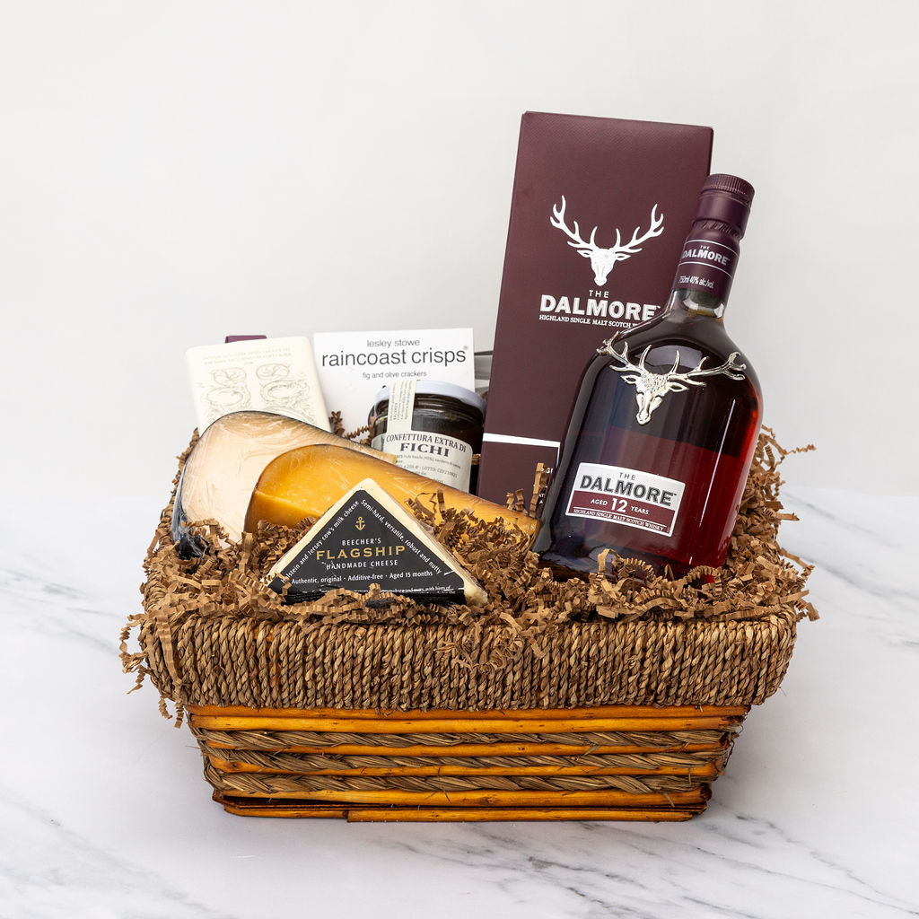 For the whisky connoisseur, we included the Dalmore 12-year-old and paired it with the perfect accompaniments, extra-aged cheddar, our popular 5-year-old Gouda, and the perfect array of sweets.